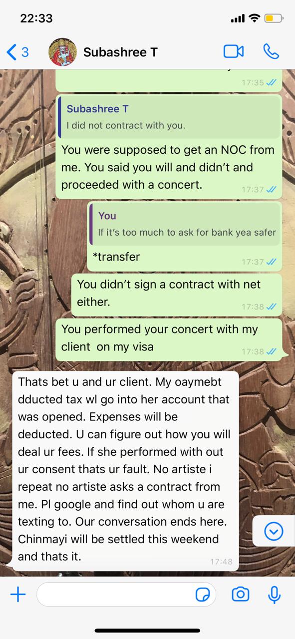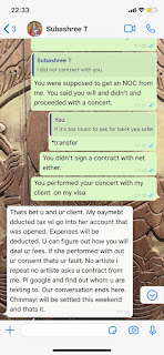 The earnings from the concert tour in the US was supposed to be my savings for a rainy day. Only that the ‘Rainy days’ were already thundering above my head. Almost 1.5 years down the line Subhashree has said none of the promoters paid her. And she doesn’t have the money to pay me. She later said in her own comment on my Instagram post that she lost money due to her own mistake.