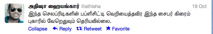 "Tamizhargal mugathil kaarithuppum chinmayi yai kandikkiren". A lot of